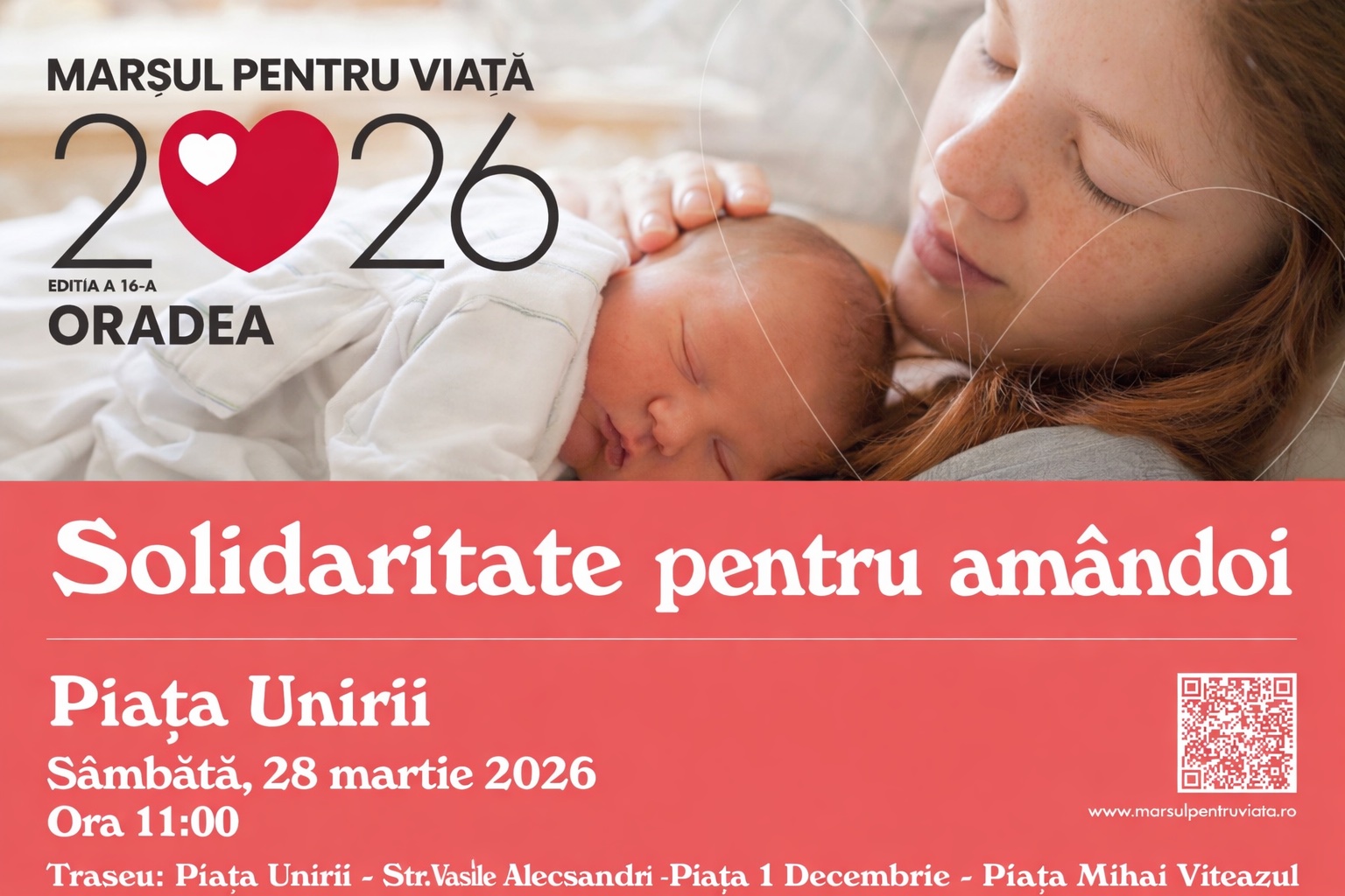Episcopia Română Unită cu Roma, Greco-Catolică de Oradea îi invită pe credincioși și pe toți cei interesați să participe la ediția din acest an a Marșului pentru Viață, programată sâmbătă, 28 martie 2026, de la ora 11:00, în Piața Unirii.